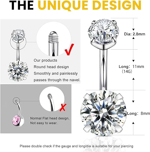 - Size and Packaging 7 pieces 14G belly button rings, steel bar length: 11 mm, zirconia diamonds 0.5 and 1 carat, gift packaged, suitable for your lover, friend, colleague or friend.