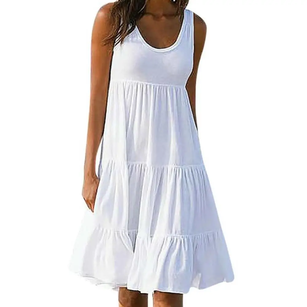 Plus Size Women Solid Color Sleeveless O Neck Stitching Pleated A-line Dress